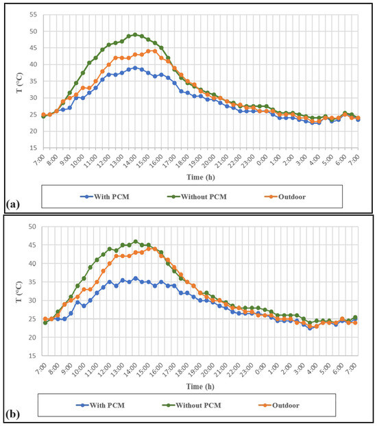 Temperature variation in the (a) ceiling and (b) room with and without a PCM.