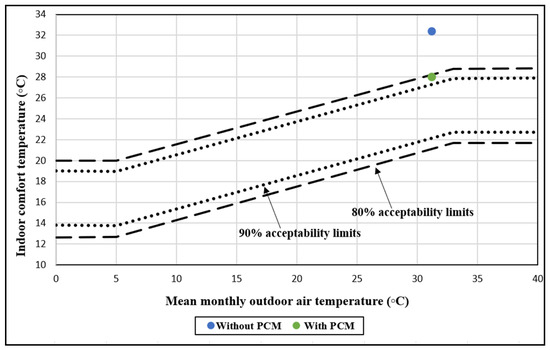 Figure 12 presents the acceptable comfort standard (ACS) assessment for the two systems. The data clearly demonstrate that the PCM-integrated system achieves superior thermal performance, maintaining indoor temperatures within acceptable comfort thresholds. This outcome is directly attributable to the PCM’s capacity to reduce peak temperatures during periods of intense solar radiation by absorbing and storing thermal energy, which is subsequently released during cooler periods. The integration of PCMs into the ceiling thus proves effective in mitigating indoor thermal peaks and enhancing overall thermal comfort.