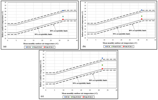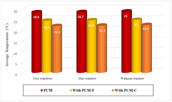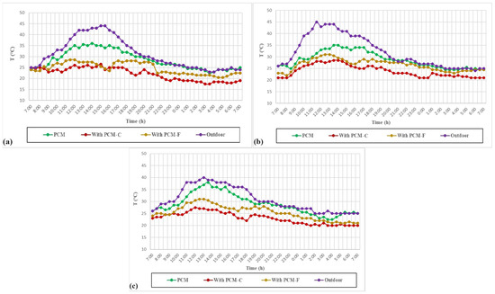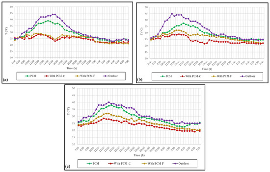 Room air temperature variations for (a) two open windows, (b) one open window, and (c) no open windows, utilizing three types of PCM: the PCM, PCM-F, and PCM-C.