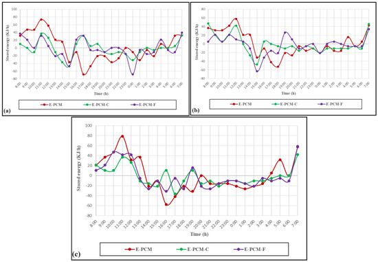 Figure 14a–c illustrate that the employment of a fan or a cooler result in a more substantial decrease in room temperature throughout the day compared to the simple PCM system. The data clearly show that the cooler provides the most pronounced cooling effect, surpassing the efficacy of both the fan and the PCM system. The maximum temperature reduction achieved with the cooler is approximately 25 °C below the outdoor temperature. In terms of the influence of the number of open windows, the temperature trends align with the observations recorded in previous studies.