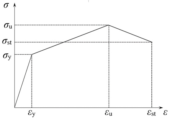 As shown in Figure 1, the steel and bolt materials adhere to a three-line isotropic hardening model corresponding to a simplified engineering stress–strain curve. In this context, σy, σu, and σst denote the yield, maximum, and failure stresses, respectively, while εy, εu, and εst represent the corresponding strains. The properties of Q235 steel and grade 8.8 M20 bolts are from Refs. [33,34]. Table 2 displays the engineering stresses and strains of Q235 steel and an 8.8-grade bolt. The Poisson’s ratio is taken as 0.3. In ABAQUS (6.1.4) analysis, it is necessary to convert engineering stress and strain into true stress and strain. The analysis applies the Mises yield criterion and mixed hardening rule reflecting the Bauschinger effect and cyclic hardening of steel.