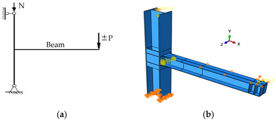 The T-shaped joint of the external steel frame was selected, with the beam and column lengths being 3000 mm and 3600 mm, respectively, measured from the hinge center. The skin steel plates on both sides of the reinforced joint region were 8 mm thick, with a width equal to the column depth and a height extending 150 mm above and below the beam depth, welded onto the column flanges. The calculation diagram is shown in Figure 2a.