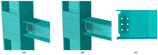 A mesh convergence analysis was conducted to verify the adequacy of the mesh size and ensure the accuracy of the result. The process involved testing the finite element model with progressively smaller mesh sizes and comparing key output parameters, including the load–displacement curves and stress distributions at critical locations. Convergence was achieved when further mesh refinement produced negligible changes in the results, confirming that the chosen mesh size reliably captured the structural behavior. The analysis demonstrated that the selected mesh sizes struck an optimal balance between precision and computational efficiency. During the meshing of the finite element model, finer meshes were applied at the beam–column joint, expected plastic hinge locations on the beam, and contact areas such as bolt holes and bolts. For the model, the mesh size was 25 mm for hot-rolled H-shapes, a 10 mm mesh size was applied to the 600 mm region at the beam-to-column connection to better capture the plastic hinge zone, 5 mm for the cover and web connection plate, and 2 mm for high-strength bolts. Figure 3 illustrates the 3D finite element local model, highlighting the meshed structure, particularly the critical areas such as the beam–column joint and cover plates. Refined mesh regions were clearly marked to enhance the visualization of the meshing strategy, as shown in Figure 3c.