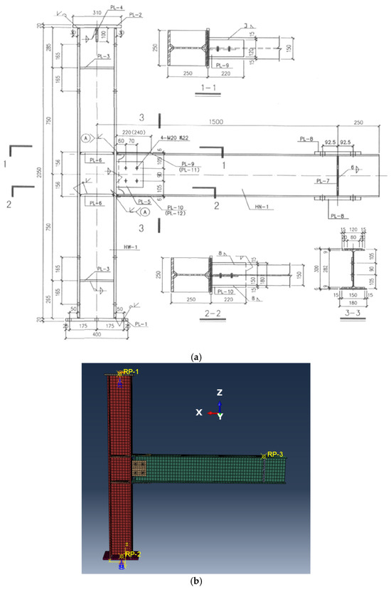 The CPS-1 Specimen, as shown in Figure 4, originally tested by Wang [38], was chosen for validation purposes. This specimen was fabricated using Q235 steel and incorporated a hybrid bolt–weld connection featuring M20 high-strength bolts. The setup involved a typical simply supported configuration with pinned connections at both beam and column ends, and an axial force of 850 kN was applied to the top of the column. Rectangular cover plates were used for both the top and bottom. The column section was HW 250 × 250 × 9 × 14, with a total length of 2050 mm, while the beam had a length of 1750 mm and a section of HN 300 × 150 × 6.5 × 9. Under displacement-controlled cyclic loading, as described by Wang [38] and conducted following ANSI/AISC 341-05 [35], forces were applied at the beam end. Loading ceased when the bearing capacity dropped to 85% of its maximum value.