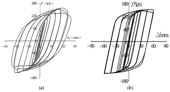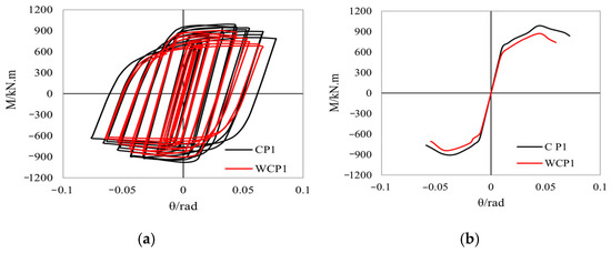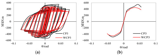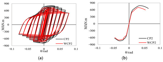The failure modes of the three groups of CP and WCP specimens are shown in Figure 8. The hysteresis curves and skeleton curves of the joints are shown in Figure 9, Figure 10 and Figure 11, respectively. The mechanical properties calculated from the skeleton curves are listed in Table 5.
