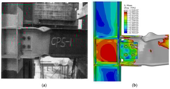 The P-Δ hysteresis curve obtained from the CPS-1 experiment is displayed in Figure 5a, while Figure 5b illustrates the corresponding P-Δ curves derived from ABAQUS simulations. Although slight discrepancies exist between the experimental and simulated hysteresis curves, their shapes exhibit high similarity. The peak load recorded during the test was 156.83 kN, whereas the ABAQUS simulation produced a maximum load of 159.5 kN, yielding an error of just 1.7%. The experimental peak load occurred at a beam-end displacement of approximately 56 mm, whereas the simulation reached its maximum load at 58 mm, demonstrating close agreement between the two. The maximum plastic rotation angle measured in the test was 4.47% rad, compared to 4.75% rad predicted by the simulation, with a difference of 6.1%. The high consistency between the ABAQUS numerical analysis and experimental results indicates that the finite element modeling and analysis in this study are reliable. Additionally, Figure 6 demonstrates that the failure mode observed in the numerical analysis is generally consistent with the experimental results. This methodology can be further employed to investigate the seismic performance of cover-plate connections.