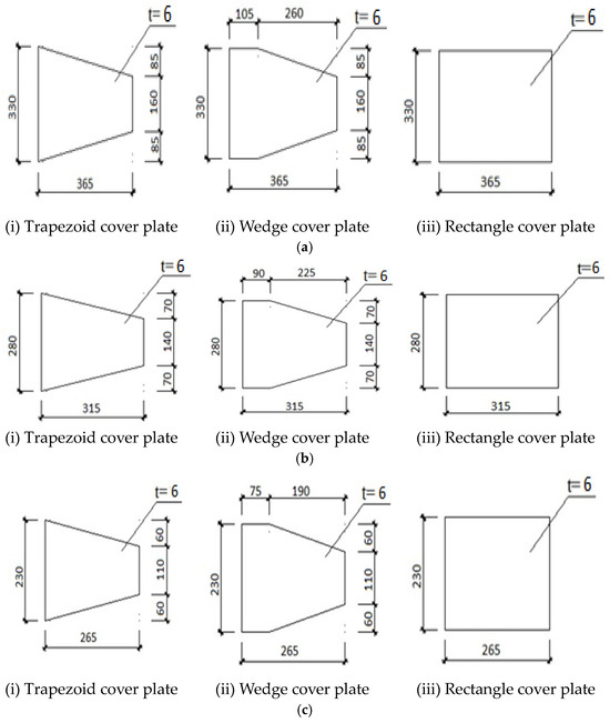 Various cover-plate dimensions (Unit: mm). (a) Cover plates for HW 350 × 350 × 12 × 19; (b) cover plates for HM 390 × 300 × 10 × 16; (c) cover plates for HM 340 × 250 × 9 × 14.