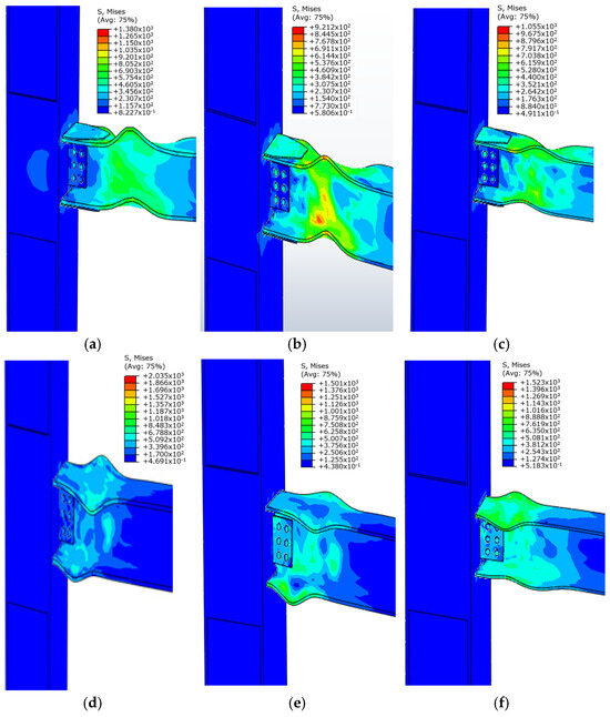 Welded connections were modeled in ABAQUS using the “TIE” command, a common FEA approach for simulating weld behavior. This method simplifies the modeling process, ensuring accurate load transfer and displacement continuity between welded components. It offers a computationally efficient and reliable way to approximate weld performance, particularly for analyzing global structural behavior such as the hysteretic response of RBS connections. Preloading of high-strength bolts was applied based on the JGJ82-2010 [36], using the “bolt load” function in ABAQUS. When preloading is applied, multiple contact interactions are established, including plate-to-beam web, bolt head-to-web, and bolt shank-to-wall interfaces. These interactions were modeled using the “surface-to-surface” contact method, assigning the stiffer surface as the master and the less stiff surface as the slave. Normal contact was “hard”, maintaining contact under compression and allowing separation under tension. Tangential contact is governed by Coulomb friction, with a friction factor of 0.44 [37] applied to the bolt connection surfaces.
