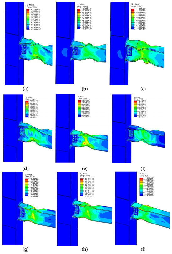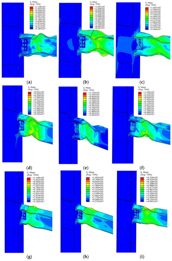 The failure modes of the CPL series joints are illustrated in Figure 13, with numerical analysis results summarized in Table 6. As shown in Figure 13, plastic hinges were successfully formed in the CPL-2 and CPL-3 series specimens outside the cover plate. In contrast, for the CPL-1 series specimens, except for CPL-1-1, the cover plates of CPL-1-2 and CPL-1-3 were located within the plastic hinge region and exhibited significant deformation. A cover plate that is too long may extend into the plastic hinge region of the beam, causing considerable deformation. This is mainly due to the excessive bending moment in the plastic hinge region, which leads to bending and local yielding. Additionally, stress concentration and deformation amplification effects are intensified. Furthermore, an overly long cover plate may lead to local buckling and uneven plastic deformation, further increasing the deformation. Therefore, for cover-plate connections using hot-rolled H-shaped beams with middle or wide flanges, the observations indicate that the cover-plate length should not exceed 0.9 times the beam depth. Additionally, based on the analysis data for the CP-2 and CP-3 series specimens in Table 6, it was found that variations in cover-plate length (within 0.90 times the beam depth) had a minor effect on the initial rotational stiffness and bearing capacity of the joints, with fluctuations within ±3%. However, as the length increased, the plastic rotational capacity θp increased significantly, with an improvement exceeding 10%. This indicates that changes in cover-plate length have a notable impact on the seismic ductility of the joints.