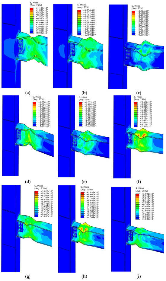Increasing the cover-plate thickness enhances the connection’s initial rotational stiffness and bearing capacity. However, its effects on joint plastic rotation capacity require quantification through numerical analysis. As shown in Figure 14, the plastic hinge of specimen CPT-1-1 extended into the cover plate, while that of CPT-2-1 slightly reached the edge. The plastic hinges, for others, were formed outside the cover plate. By examining the ratio of cover-plate thickness to beam flange thickness (Table 4), it was found that when the cover-plate thickness is greater than or equal to 0.3 times the beam flange thickness, the combined thickness of the cover plate and beam flange is less than the column flange thickness, and cover-plate connections can achieve the performance of reinforced connections for hot-rolled H-shaped beams with middle or wide flanges. This significantly enhances the ability to extend plastic hinge formation outward. Additionally, the data in Table 6 show that for the CPT specimens in this study, the increase in cover-plate thickness improved the initial rotational stiffness and bearing capacity by less than 5%, which can be considered negligible. The joint’s plastic rotational capacity reductions are more than 5%, warranting consideration of its impact. The mechanism behind this phenomenon can be explained as follows: increasing the cover-plate thickness increases the local stiffness of the beam end, thereby enhancing the connection’s load-bearing capacity. However, as the stiffness increases, the plastic deformation capacity of both the cover plate and the beam end is restricted. Although the plastic hinge is pushed out to the cover plate, this also reduces plastic rotation capacity. In contrast, a thinner cover plate offers less deformation constraint due to its lower stiffness, causing the cover-plate region to undergo plastic deformation prematurely. This prevents the plastic hinge from moving outward while reducing the load-bearing capacity.