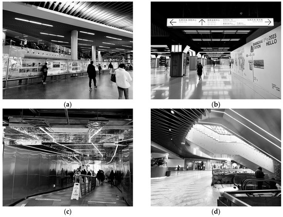 Case study of Shanghai: (a) the underground space of Shanghai People’s Square; (b) the underground space of Hongqiao Hub; (c) the public underground transport space at Jing An Temple; and (d) the underground space at Wujiaochang.