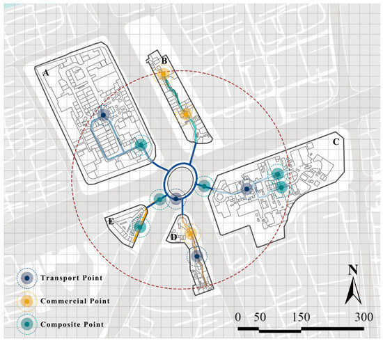 Initially, spatial data were collected on-site, and the analysis was conducted using Depthmap X for quantification, employing the DBSCAN clustering function to delineate the functional spaces (specific operational processes are detailed in Appendix A) [33,34,35]. Ultimately, collection points exhibiting distinct functional characteristics were identified, as shown in Table 2. These areas include underground public walkways, commercial walkways, sunken plazas, and other public spaces. The collection points are categorised into commercial-oriented and transport-oriented points, with composite points indicating areas that serve both traffic and commercial functions, as depicted in Figure 2 and Table 2.