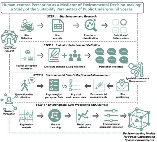 The study investigates the influence of physical environmental factors on users’ perceptions of underground spaces and ultimately proposes strategies for regulating the spatial environment. The specific research steps are shown in Figure 3.