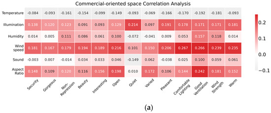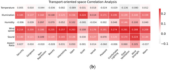 Matrix of correlation coefficients between human-centred perception evaluation and physical environment data: (a) matrix of correlation coefficients for spatial sensory indicators of commercial-oriented space; and (b) matrix of correlation coefficients for spatial sensory indicators of transport-oriented space.