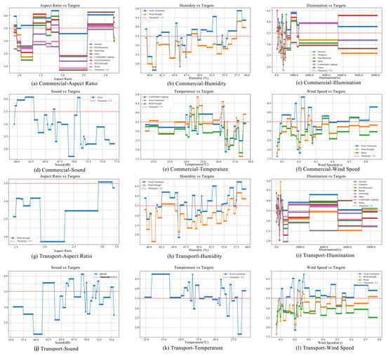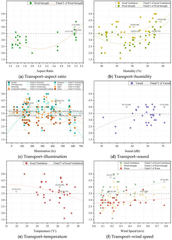 In contrast, the transport-oriented space (as shown in Figure 6) exhibits a more refined trend in physical environment parameters. The aspect ratio, ranging from 3.12 to 3.20, significantly correlates with increased user satisfaction regarding wind strength, achieving a peak rating of 4.00. The recommended ranges for humidity and illumination are from 50.09% to 59.20% and from 142.19 lx to 480.03 lx, respectively. Notably, humidity is highly correlated with perceptions of ventilation, while lower illuminance levels (e.g., 158.80 lx and 474.00 lx) align more closely with user preferences for transport spaces. The regression analysis for sound indicates that user satisfaction with quiet is significantly enhanced when noise levels fall between 63.15 dB and 75.45 dB. Temperature is most effective in the range from 21.95 °C to 26.20 °C, optimising perceptions of ventilation and warmth, thereby improving overall satisfaction. Furthermore, wind speed ranging from 0.18 m/s to 0.78 m/s is the most effective in enhancing user satisfaction with good ventilation and warmth. Specifically, wind speed in this range demonstrates a marked increase in ratings for good ventilation and wind strength, with satisfaction peaking at 4.75 for a wind speed of 0.67 m/s.