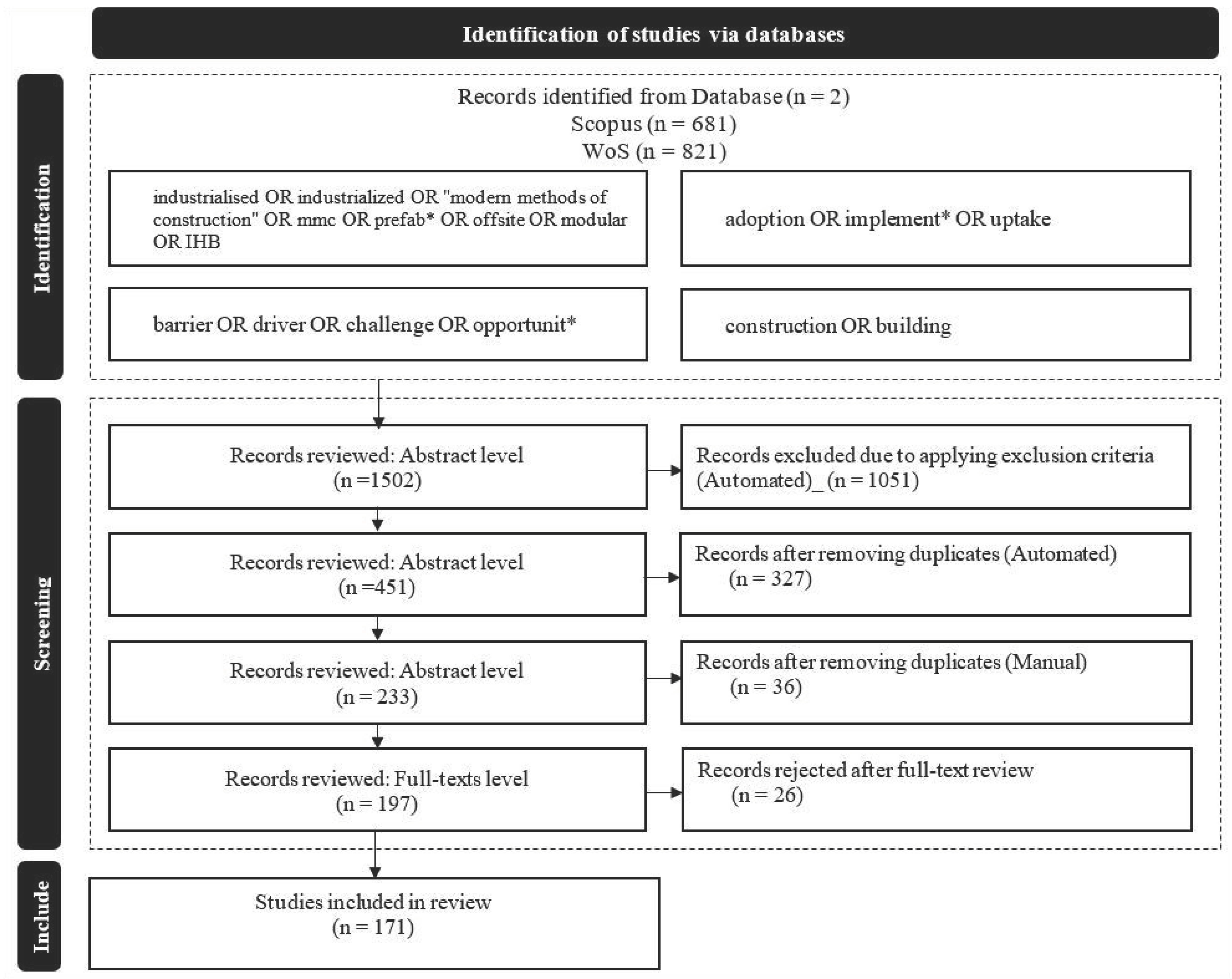 TITLE-ABS-KEY (industrialised OR industrialized OR “modern methods of construction” OR mmc OR prefab* OR offsite OR modular OR IHB) AND TITLE-ABS-KEY (adoption OR implement* OR uptake) AND TITLE-ABS-KEY (barrier OR driver OR challenge OR opportunit*) AND TITLE-ABS-KEY (construction OR building)
