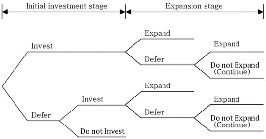 By integrating key financial variables, including investment costs, volatility, and risk-neutral probabilities, the model enables a comprehensive scenario analysis that reflects the flexibility and strategic value of modern real estate financing methods. The aforementioned scenario is illustrated in Figure 3, which depicts the sequential-compound-options framework.