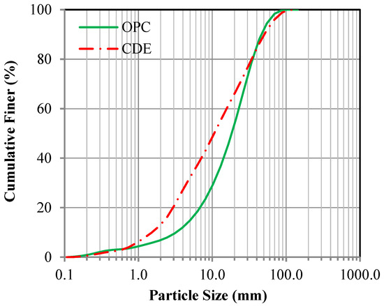 The cement employed was OPC type I from PT. Semen Padang, with a 539.80 m2/kg specific surface area and a 3.15 specific gravity. The particle size distribution of OPC was investigated using a PSA (particle size analyzer) test by applying a MicroBrook 2000 L PSA, manufactured by Brookhaven Instruments, New York, NY, USA, and the results are shown in Figure 1. Additionally, the chemical composition of OPC shown in Table 1 was tested using the XRF method utilizing the XRF Analyzer of Rigaku Supermini200, manufactured by Rigaku Holdings Corporation, Tokyo, Japan. Moreover, an XRD test was conducted to study the crystal structure and mineralogical characterization of OPC. In this study, a Maxima XRD-7000 device manufactured by SHIMADZU, manufactured by Shimadzu Corporation, Kyoto, Japan was used. The XRD device uses X-ray radiation from an XRD tube with Cu kα radiation at a wavelength of 1.54056 Å.