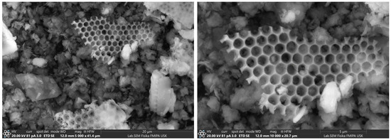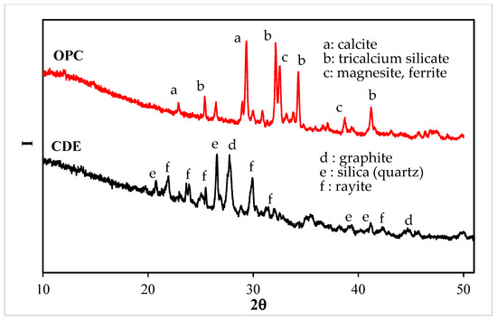Diatomaceous earth was employed as a mineral additive to substitute part of the cement as a binder. It was obtained in chunks from Beureunuet Village, Aceh Besar Regency, which has approximately 40,353,700 tons deposit based on the data issued by the Aceh Province Mining and Industry Service [57,58]. The samples collected were oven-dried at 100 °C for 24 h, ground, and sieved to pass through sieve #200. The powder produced was calcined in a furnace at 500 °C for 5 h. The CDE had a specific gravity of 2.00, a 675.60 m2/kg specific surface area, and a 6.54% absorption. The PSA results in Figure 1 showed that the CDE had finer particles than OPC. Moreover, the XRD test suggested that the main crystalline minerals of the CDE were silica in the form of quartz, graphite, and rayite, as presented in Figure 2. The XRF test applied also showed that the main composition of the CDE was silica (SiO2) at 78.73%, as presented in Table 1. This showed the possibility of using the material as a mineral additive to replace part of the cement. Microphotograph tests conducted using scanning electron microscopy (SEM) showed that the CDE particles had a cellular structure with pores measuring nanometers to micrometers as presented in Figure 3.