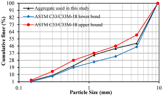 Two types of aggregates were used: fine aggregates (particle size = 0.15–2.36 mm) and coarse aggregates (particle size = 2.36–9.52 mm). As a fine aggregate, RS (river sand) was employed and obtained from the Krueng Aceh River. Meanwhile, as a coarse aggregate, crushed stone (CS) was employed and obtained from the stone-crushing industry in Aceh Besar Regency. The aggregates’ physical properties and gradation can be seen in Table 2 and Figure 4, respectively. The granulometric curve in Figure 4 shows the particle size distribution of the combination of those 2 types of aggregates, with a particle size distribution of 0.15–9.52 mm. The aggregates’ physical properties and gradation meet the prerequisites for concrete aggregates based on the ASTM C33/C33M-18 standard [59].