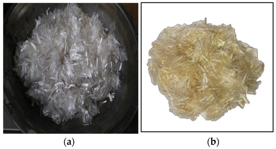The 2 types of fibers used were polypropylene and glass, as presented in Figure 5. The polypropylene fiber had a diameter of 18 μm, a specific gravity of 0.9, a length of 12 mm, an elastic modulus of 6000–9000 MPa, and a tensile strength of 300–400 MPa. The glass fiber had a diameter of (13 ± 2) mm, a specific gravity of 2.7, a tensile strength of 550 MPa, a ZrO2 content of ≥16.7%, and an elastic modulus of 10,000 MPa. Additionally, it came in a lengthy roll that needed to be cut into 10-mm pieces before use.