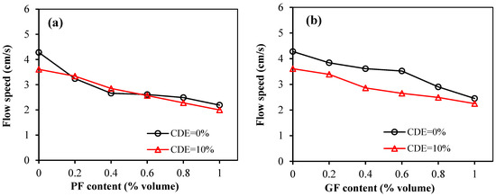 Flow speed of fresh HSC with (a) polypropylene fiber and (b) glass fiber.