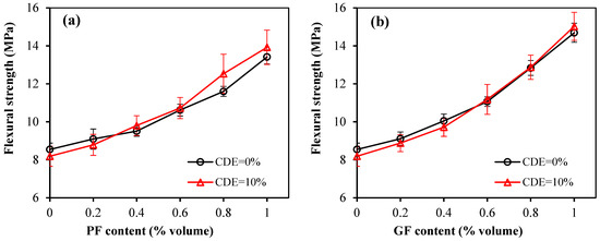 Flexural strength of HSC with (a) polypropylene and (b) glass fibers.