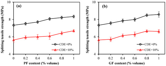 Splitting tensile strength of HSC with (a) polypropylene and (b) glass fibers.