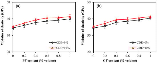 Figure 10 demonstrates the average modulus of elasticity value for HSC with and without CDE in relation to fiber content. The modulus of elasticity for HSC with CDE was lower than that without it, which was identical to the trend in compressive strength as well as consistent with the report of a prior study [16]. Meanwhile, the addition of polypropylene and glass fibers substantially enhanced the value. The rate of increase due to the administration of more fiber content in HSC with CDE was not much different from that in the specimen without the additive.