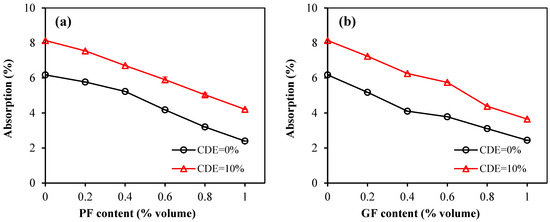 Figure 11 shows the average absorption capacity of HSC with and without CDE as a function of fiber content. It was observed that HSC with CDE had higher capacity due to the nanoporous cellular structure of CDE particles with a 6.54% absorption rate. The result was consistent with a report presented in a prior study [55,81]. Meanwhile, the incorporation of polypropylene and glass fibers lowered the absorption value very significantly. It was also found that the rate of decrease due to the increase in fiber content was not significantly different for HSC with and without CDE. Polypropylene or glass fibers improve the microstructural integrity by bridging cracks and minimizing void formation, resulting in a denser matrix with lower porosity. Additionally, fibers disrupt capillary pathways, reducing interconnected voids that facilitate water movement. The increased surface area from the fibers enhances bonding with the cement matrix, contributing to more cohesive and less permeable structures. Certain synthetic fibers also exhibit hydrophobic properties, repelling moisture and decreasing water absorption.