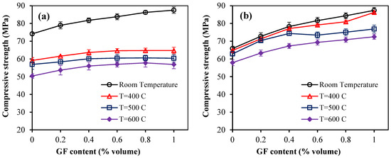 HSC compressive strength with (a) polypropylene and (b) glass fibers.