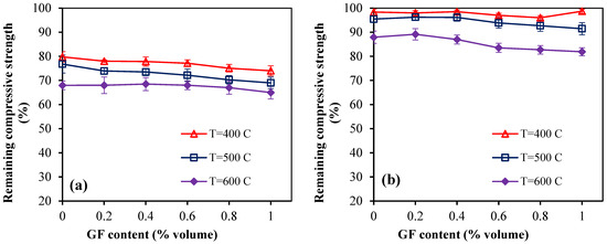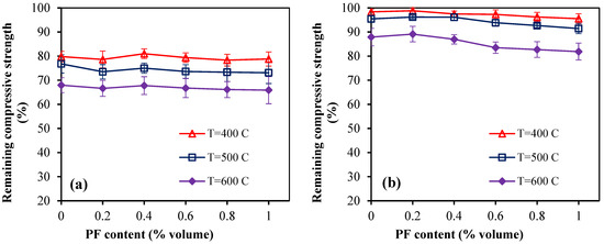 The exposure test was used to define the resistance of HSC to high temperatures. This was achieved by inserting the specimens into the laboratory furnace at 400, 500, and 600 °C for 5 h, respectively. After exposure, each specimen was taken out of the furnace and allowed to return to room temperature, followed by the compressive strength determination. The resistance to high temperatures was analyzed as the ratio of compressive strength after exposure to the initial compressive strength, with the result expressed as a percentage. The exposure temperatures and the test procedure were based on a previous study [67].