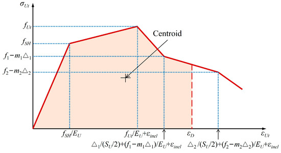 where Δ/(SU/2) is the strain caused by crack propagation; σUt/EU is the strain caused by elastic deformation of UHPC between cracks; εinel is the plastic strain caused by micro-cracks. By converting the stress–crack width relationship into a stress–strain relationship according to Equation (2), the stress–strain constitutive model shown in Figure 2 is obtained.