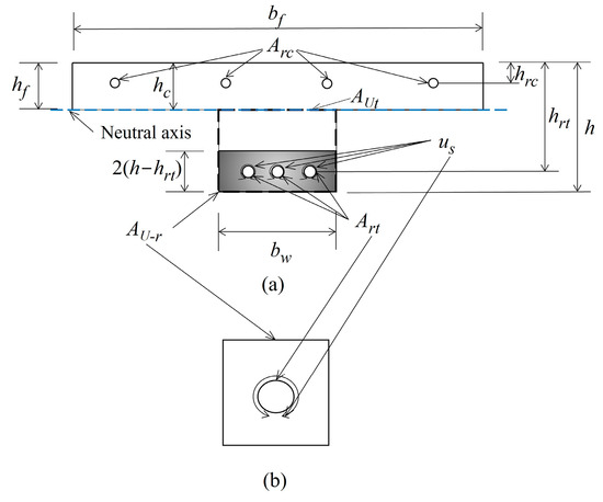 where AUt is the area of the UHPC tensile zone; h − hc is the height of the tensile zone; is the average stress of UHPC in the tensile zone and can be determined by