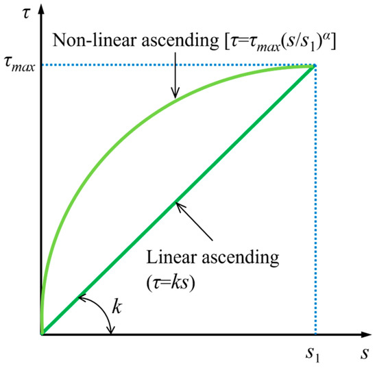 where τmax is the maximum bond stress (bond strength); s1 is the slip corresponding to the bond strength; α is the fitted coefficient of bond behavior of the reinforcement–UHPC interface. Figure 5 illustrates the relationship between these parameters including τmax, s1, and α, which is typically determined through pull-out tests of the reinforcement within the concrete.