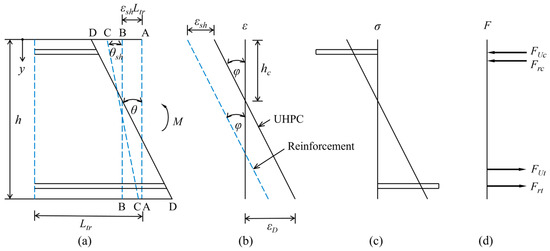 To ascertain the moment–rotation behavior of a beam, the uncracked segment as shown in Figure 6a is initially considered. It is assumed that the stress transfer length Ltr is equal to half the crack spacing (SU/2), while the A-A section represents the initial position of the segment. As the shrinkage strain develops in the segment, if the reinforcement is not bonded, the resulting contraction is manifested as Section B-B. Due to the bond nature between UHPC and reinforcement, the contraction results in compressive forces being exerted on the reinforcement, while tensile forces are generated in the concrete to maintain equilibrium. This leads to the formation of Section C-C at a rotation angle θsh. The application of an external moment results in an increase in rotation θ to achieve equilibrium between force and moment, leading to the formation of Section D-D. For analytical purposes, the shrinkage strain εsh can be determined by shrinkage-relevant tests of UHPC material. The influence of creep can also be incorporated through the modification of the elastic modulus of UHPC using the age-adjusted effective modulus method [31,32]. A division of the deformation profile in Figure 6a by the transfer length Ltr produces the strain profile illustrated in Figure 6b, which represents the strain subsequent to the imposition of shrinkage strain and external moment. The sectional strain distribution of both UHPC and reinforcement is defined in Figure 6b, where the difference in their strains represents the shrinkage strain.