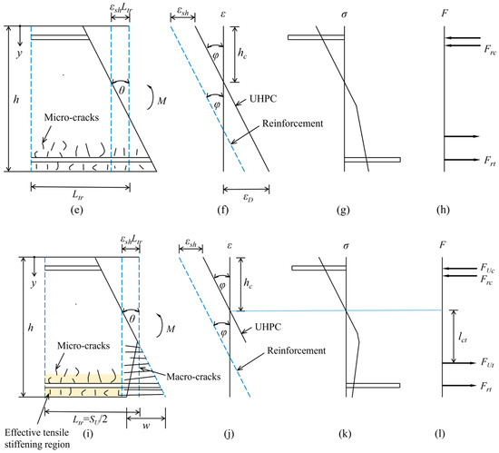 Based on the strain distribution and constitutive relationship of UHPC material, the sectional stress distribution can be obtained as shown in Figure 6c, and its integration then produces the internal force profile in Figure 6d. By applying the force and moment equilibrium equation, the relationship between the external moment M and curvature can then be solved. As the growing of the external moment, the strain εD of UHPC bottom face will eventually reach the multi-cracking strain. Thereafter, the segment in Figure 6a is replaced by the one shown in Figure 6e. The emergence of microcracks leads to the stress hardening of UHPC, as illustrated in Figure 6g. Upon arrival of strain εD at the macrocracking strain, fUt/EU + εinel, macrocracks are initiated on the bottom face of beam, as represented in Figure 6i. The presence of macrocracks indicates the stress softening of UHPC tensile response, as shown in Figure 6k. In the post-cracking phase, the tension contribution of UHPC is elaborately modeled by considering the conversion of stress–crack width relationship into a post-cracking stress–strain relationship according to Equation (2), as shown in Figure 2. In this situation, the effective stiffness of the tensile reinforcement increases due to the tensile stiffening effect. It is represented by the multiplication of the axial rigidity of the reinforcement by the tension-stiffening parameter defined by Equation (10). By employing the moment–rotation approach, enables the derivation of the relationship between moment–curvature and moment–crack width and further determines the deflections and crack widths in the section.