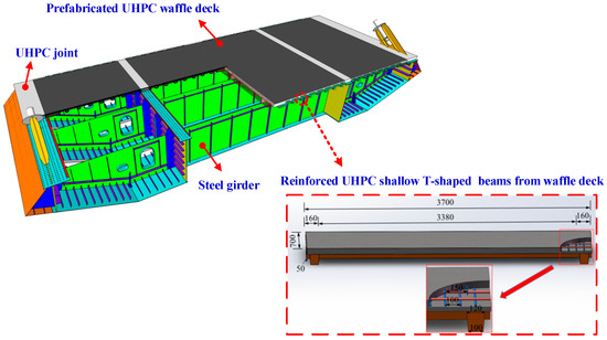 In recent years, there has been an increasing utilization of UHPC in the field of steel–concrete composite beam bridges, particularly in the context of waffle-type UHPC bridge decks. This trend is driven by the urgent motivation to enhance the strength of waffle concrete decks and address the issue of premature cracking observed in such mechanically insufficient concrete elements [14,15]. Compared to normal concrete, the increased strength and ductility of UHPC result in a reduction in material consumption and structure weight for waffle deck construction under the same loading conditions. Consequently, the utilization of UHPC is particularly pertinent and widespread in lightweight waffle deck configurations. As a result, UHPC can be cast in a thinner thickness or depth than traditional concrete to produce a shallow bridge deck. However, this reduction in thickness will inevitably lead to a compromise in the flexural stiffness of the cross-section and the crack resistance of the shallow bridge deck. The waffle-type UHPC bridge decks are structurally composed of reinforced UHPC shallow beams with T-shaped cross-sections in a separate direction, namely reinforced UHPC shallow T-shaped beams. The crack resistance and crack evolution mechanisms of the aforementioned reinforced UHPC shallow T-shaped beam are fundamental from both a structural safety and a serviceability perspective. This is due to the fact that excessive deflections and crack widths under service loads will significantly impair the long-term functionality and durability of these shallow structures.