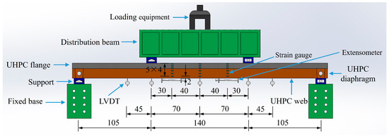 All reinforced UHPC shallow T-shaped specimens are applied to four-point loading where the boundary of the specimen and the distribution beam are simply supported. The experimental setup for the four-point bending tests is illustrated in Figure 10, which includes specimen dimensions, support conditions, and instrumentation used. The loading scheme is set with a step-by-step force-controlled loading in the early stages, followed by displacement-controlled loading after the reinforcement yielding.