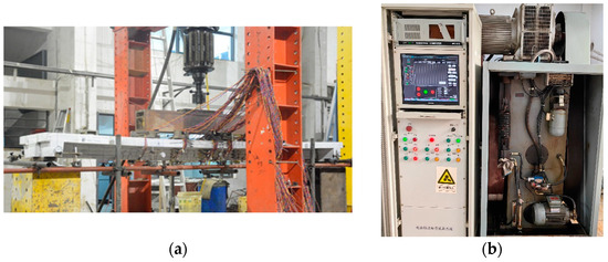 Photos of four-point bending tests for reinforced UHPC specimens: (a) test setup and loading scheme; (b) electro-hydraulic automatic control testing machine.