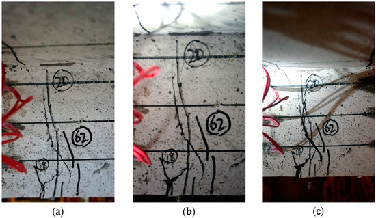 Crack patterns observed during different phases of loading for the specimen of R-UHPC-1. (a) at the stage of nonlinear elasticity; (b) at the stage of tension stiffening; and (c) at the stage of reinforcement yielding.