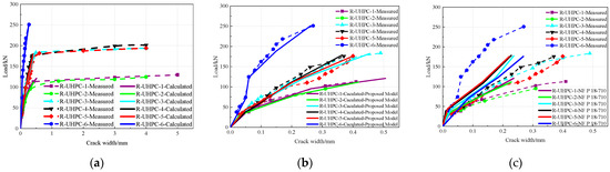 Load–crack width curves of reinforced UHPC shallow T-shaped specimens in static flexural tests: (a) load–crack width curves of the whole response; (b) comparison between measured curves prior to reinforcement yielding and calculated curves derived from the proposed model; and (c) comparison between measured curves prior to reinforcement yielding and calculated curves based on NF P 18-710.