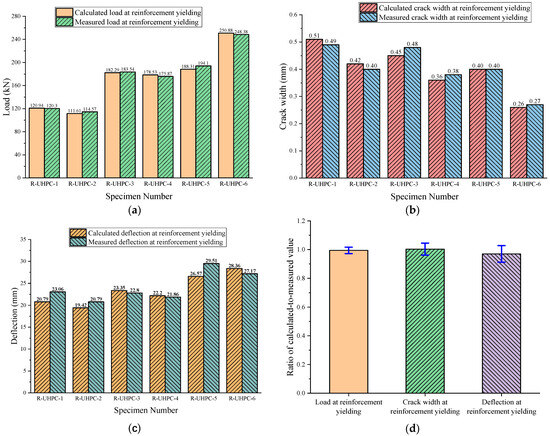 Graphical comparison between calculated values and measured values of reinforced UHPC shallow T-shaped specimens. (a) Loads at first cracking; (b) crack widths at reinforcement yielding; (c) deflections at reinforcement yielding; and (d) ratios of calculated-to-measured values.