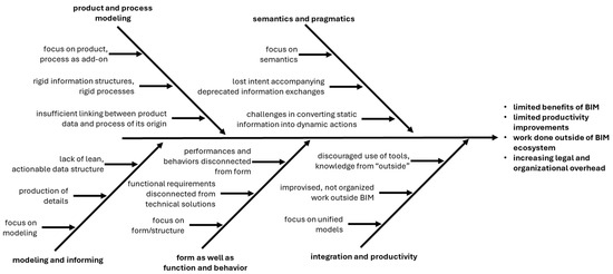 As Turk [31] points out, and as van Leeuwen and Fridqvist [32] concur, BIM often leans too heavily on representing reality instead of emphasizing the pragmatic use of information to drive action. The models are designed to replicate the “place of things” but frequently fail to inform the “forum for action”. Eastman et al. [33] similarly criticize BIM for its limited integration into project workflows, arguing that while it excels in design visualization and coordination, its full potential lies in its ability to guide the actions of project teams.