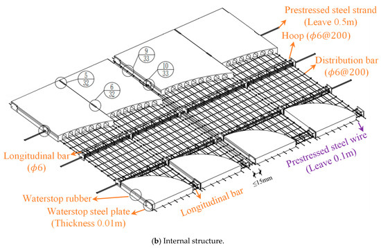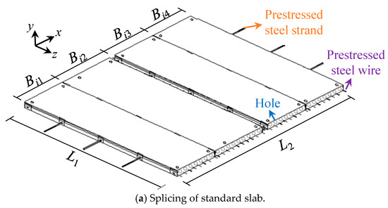 Some academics have also worked on bidirectional, prestressed, precast slabs. Derkowski et al. [18] used FEM and experiments and discussed the influence of the flexibility of girders in slim floor structures on the reduced load capacity of prestressed HC slabs. Di et al. [19] conducted an experimental investigation of the shear performance of existing PC hollow slabs. They found that laying an additional layer of structural topping on precast hollow-core slabs significantly increased the shear capacity of the floor, and thus safety of the structure. Joo et al. [20] analyzed the composite behavior of hollow-core slabs and core-filled concrete on the inner surface of hollow-core slabs. Cheng et al. [21] conducted internal force calculation and numerical analysis of unbonded and bonded prestressed hollow beams with a mix of two-way system board structures. Yi et al. [22] experimentally investigated the impact-resistant capacity and failure behavior of bidirectional prestressed concrete slabs, but not hollow-core slabs. Moreover, the uncertainty analysis for structures are quite vital [23]. However, most of the existing research focuses on improving the performance of materials and structures and lacks in enhancing and improving the assembly rate, thus limiting the popularization of precast slabs. New prestressed precast hollow-core slabs need to not only meet the requirements of existing codes (e.g., GB 50010-2010 [24]), but also verify the strength of the design through experiments and methods such as FEM.