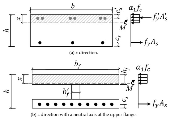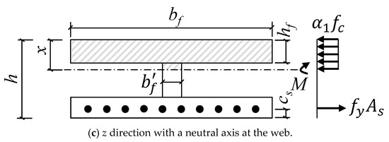 Bidirectional, prestressed, precast hollow-core slabs have holes parallel to the z-direction, so that the two directions of the hollow-core slabs have very different shapes in the positive section. The bidirectional slab is calculated as a rectangular cross-section in the x-direction and a T-shaped cross-section in the z-direction. T-section bending calculations are divided into two categories: the first is where the center-closing axis is inside the flange, and the second is where the center-closing axis is outside the flange. Figure 2 illustrates the three kinds of analytical models of normal cross-section bearing capacity of hollow slabs.