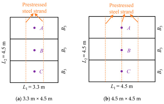 For the proposed bidirectional, prestressed, assembled floor structure, two types of prefabricated slabs with dimensions of 3.3 m × 1.5 m and 4.5 m × 1.5 m were fabricated, and three panels were transversally connected by wet joints and prestressed steel wires to form a large-scale integral floor slab with dimensions of 3.3 m × 4.5 m and 4.5 m × 4.5 m, respectively, as shown in Figure 3. The points A, B and C are the centers of each standard slab. The thickness of the two kinds of slabs are 0.12 m and 0.14 m, respectively. There is no definite reason for the selection of these two types of panels, with the main consideration being the conditions of construction and applied loads.