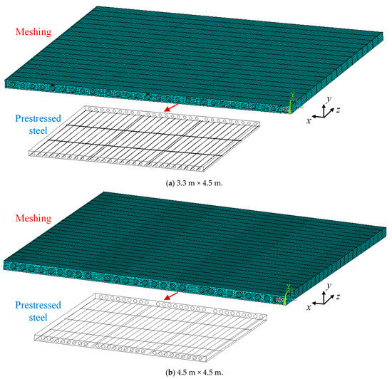 Concrete is simulated using the Solid 65 unit; reinforcement and prestressing tendons are simulated using the Link 180 unit. It is assumed that the reinforcements are bonded well to the concrete and there is no slippage. Due to the symmetry of the hollow-core slab, a 2D mesh can be generated by first generating a 2D mesh and then sweeping it to generate a 3D version. The number of discretized elements for the 3.3 m × 4.5 m slab and 4.5 m × 4.5 m slab are 18,200 and 26,700, respectively. Both hollow-core slabs had 27 holes and 30 prestressing steel wires. Different numbers of prestressing steel strands were used for the two kinds of hollow-core slabs, with two bundles for the 3.3 m × 4.5 m slab and three bundles for the 4.5 m × 4.5 m slab.