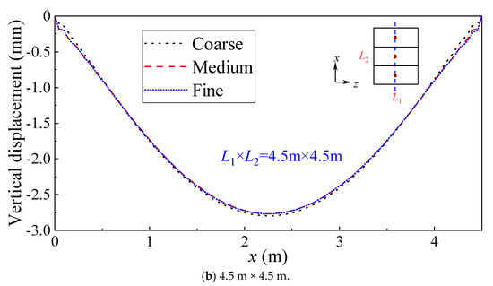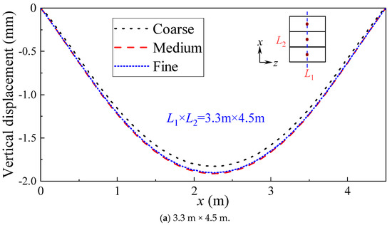 Three mesh schemes are checked for the two kinds of slabs to validate the grid independence. For the 3.3 m × 4.5 m slab, the number of meshing for coarse, medium, and fine meshes are 7400, 18,200, and 40,900, respectively, while for the 4.5 m × 4.5 m slab they are 10,700, 26,700, and 46,700, respectively. The loading case of 8 kN/m2 is selected for comparison, and Figure 7 displays the vertical displacement for the three mesh schemes. The results show that the maximum error between the coarse scheme and fine scheme and between the medium scheme and fine scheme is 3.92% and 0.72% for the 3.3 m × 4.5 m slab, respectively, and 3.68% and 1.16% for the 4.5 m × 4.5 m slab, respectively. Therefore, considering the computational accuracy and efficiency, the medium scheme is chosen to carry out a follow-up study for both types of slabs.