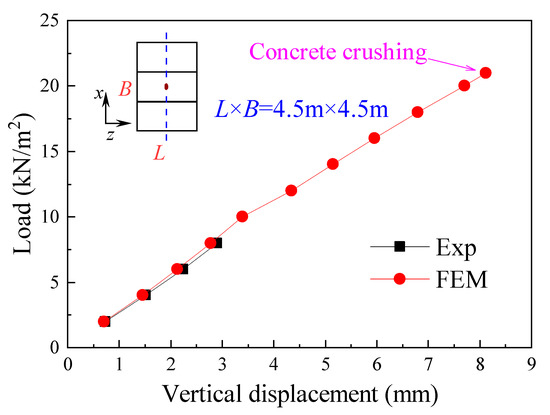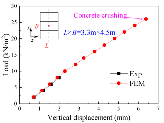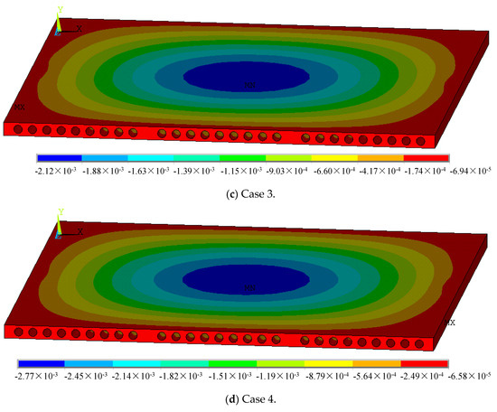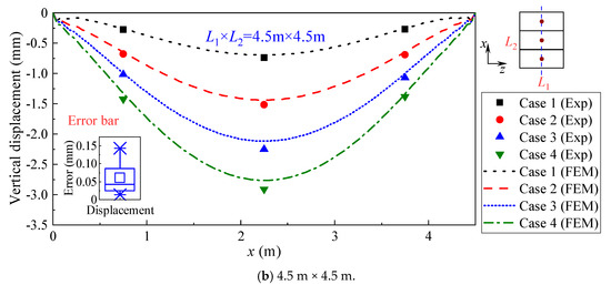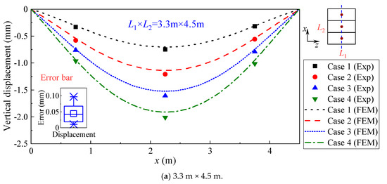 In this section, the experimental and FEM results of the two slabs are compared, and the comparison results are plotted in Figure 8 with error bars. Here, Case 1, Case 2, Case 3, and Case 4 correspond to the four loading cases, i.e., 2 kN/m2, 4 kN/m2, 6 kN/m2, and 8 kN/m2. It can be found that the experimental results and FEM results of both plates are in good agreement, indicating that the FEM simulation has a certain accuracy and reliability. For the 3.3 m × 4.5 m slab, both the mean and median errors of vertical displacements are 0.04 mm. For the 4.5 m × 4.5 m slab, the mean and median errors of vertical displacements are 0.06 mm and 0.04 mm, respectively. Therefore, the mean value of the overall prediction error of FEM for both slabs is 0.05 mm. Since the experimentally measured data are very limited and proved to be in good agreement with the FEM results through comparison, the subsequent analysis is mainly based on the FEM results.